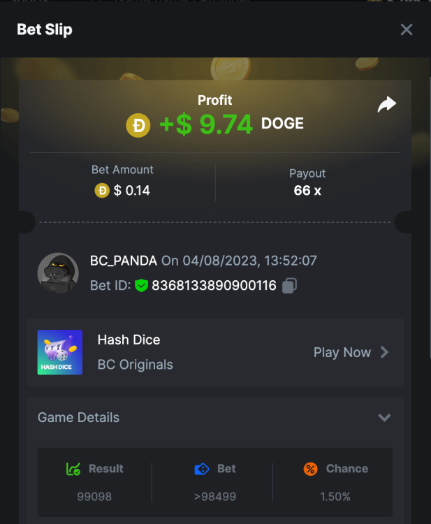 $5k Prestige Hash Dice Challenge #100 DURATION: 4th AUG - 11th AUG 12:30 pm UTC Greetings, esteemed VIPs! We are thrilled to extend our warmest welcome to each one of you. This week, we have an eagerly anticipated treat in store - the Hash Dice event, featuring an incredible prize pool of $5,000! The challenge is scheduled from 4th August to 11th August, commencing at 12:30 UTC. Kindly review the terms and conditions below attentively to grasp how you can partake in this exhilarating occasion. Wishing the best of luck to all participants! What's the Challenge? Complete as many of the following 20 payouts on Hash Dice. Must be a exact multiplier. | 22 | 33 | 44 | 55 | 66 | 77 | 88 | 99 | 111 | 222 | 333 | 444 | 555 | 666 | 777 | 888 | 999 | 1111 | 2222 | 3333 | Each payout you hit above counts as 1 point (Maximum 1 point for each payout). If there is a tie, the player with the higher average bet amount (in USD) shall be the winner. How to Enter To enter, copy the link of the bet you'd like to submit. Once you've copied it, paste it as a reply to this thread like so: Link: https://bc.game/#/sd/11F9I4D1YXDFFR In the same post, upload a screenshot of your win by clicking the game ID WITH VIEW IN USD mode ENABLED (accessible at the bottom of dropdown menu for your wallet up top. This way, we can ensure that your bet indeed met the minimum requirement at the time of placing it: Link: https://bc.game/#/sd/11F9I4D1YXDFFR Minimum VIP Minimum VIP 4 with phone verified will be eligible! Eligibility to Win Prize Win at least 3 payouts to qualify. Minimum Bet Size $0.15 equivalent Eligible Coins All cryptocurrencies are eligible (excepting JB) Available Prizes GENERAL TERMS Please combine all of your hits together in a SINGLE post. Edit your existing post for additional hits, don't create a new post. Each eligible entry must have the Bet Slip URL, failure to include it will disqualify participation in the event. Bet Slip image is not mandatory. Bets must be posted within 24 hours of placing bet in order to keep things fair for everyone. Bets must be made during the specified time window stated above. This thread will lock automatically when the time period is over. One (1) entry per household. Anyone found attempting to win multiple prizes will be disqualified from this challenge as well as all future challenges. Failure to follow instructions will result in your submission being null and void. By entering this challenge, you acknowledge that BC.Game has the final decision on results and placement. Payouts will be distributed after the event is finished. Please note that it could take anywhere between 24 hours to 7 days after the completion of the event.