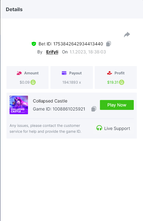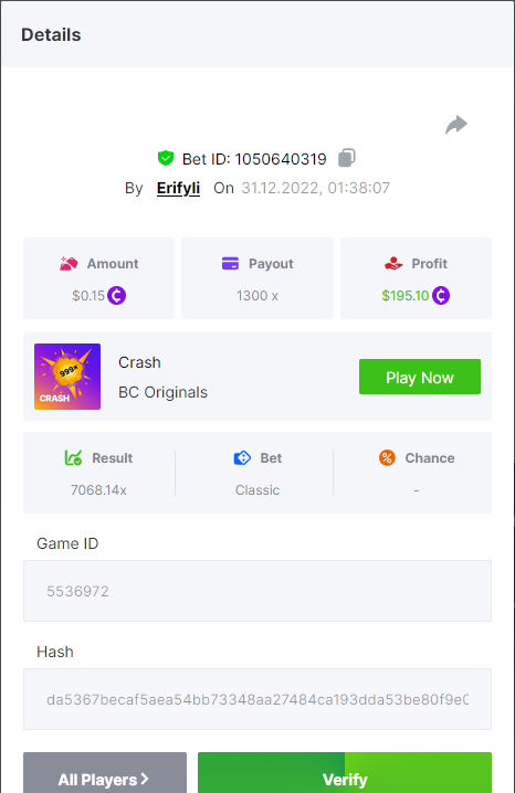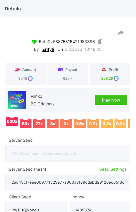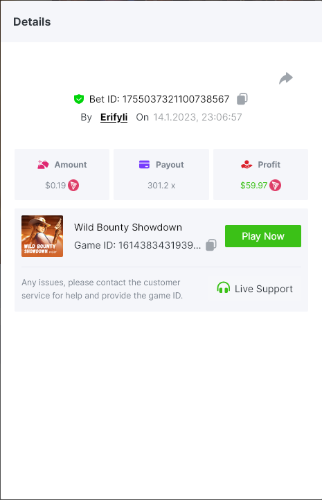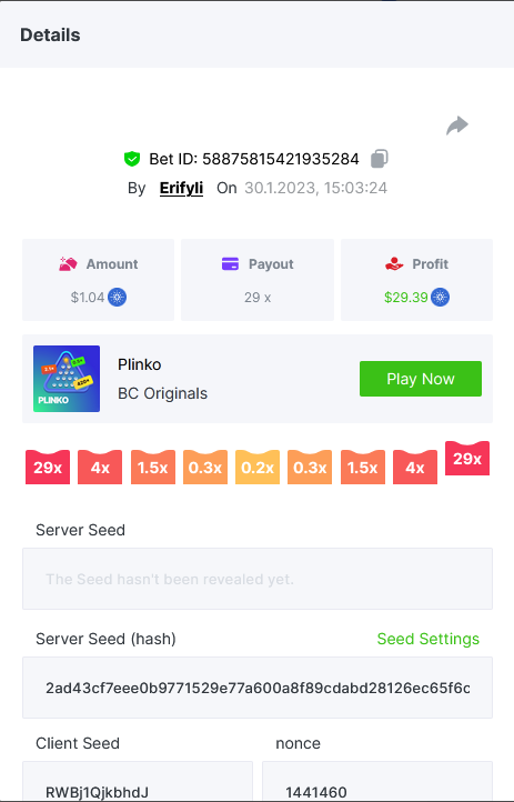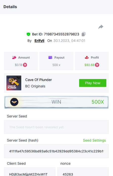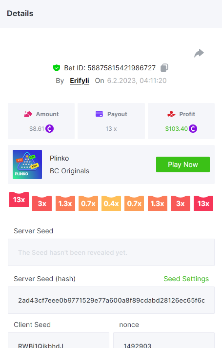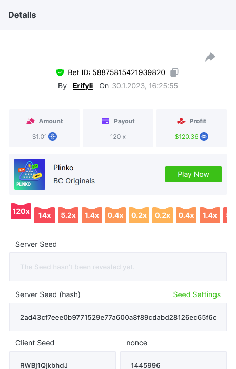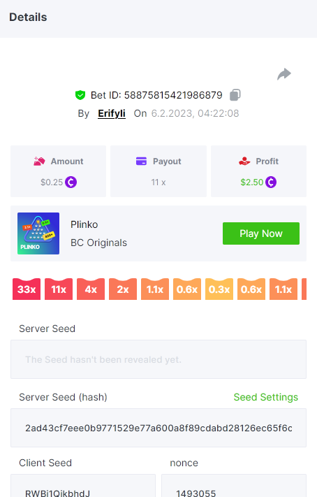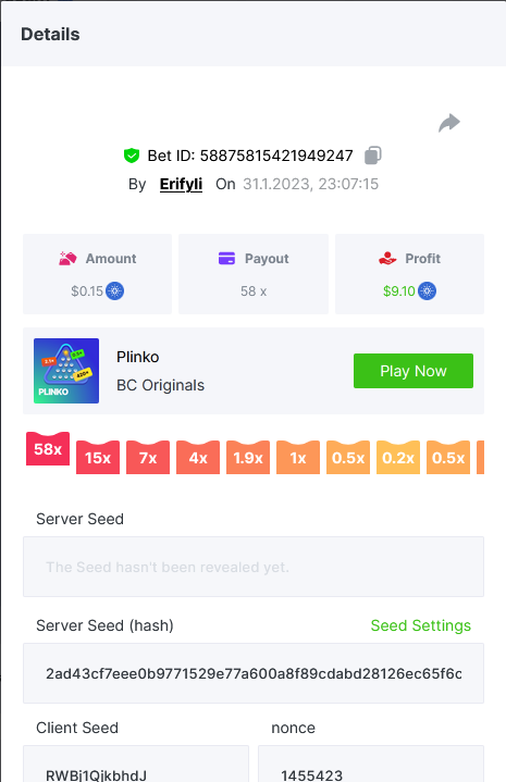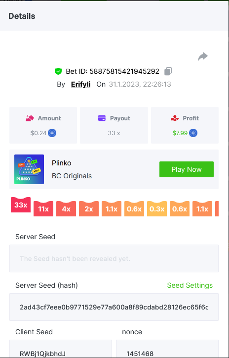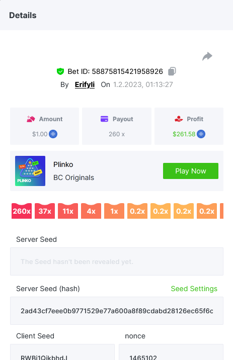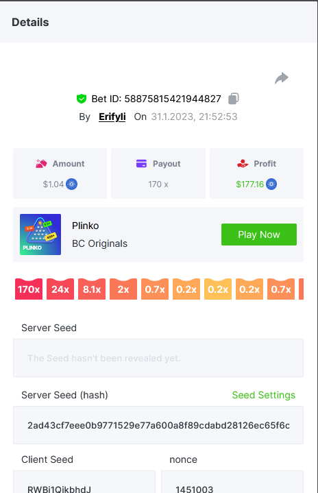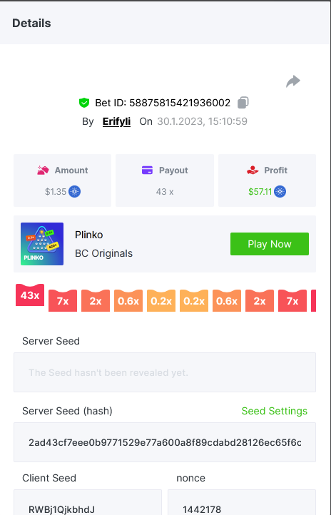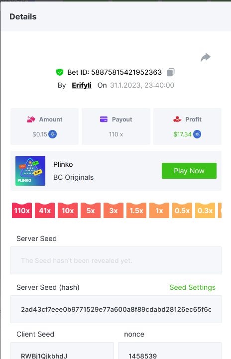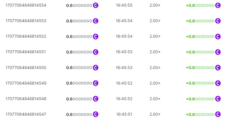 Bounty ? https://bc.game/#/sd/1123A7FXI98S9F The exact amount paid in the game was 50x but the multi shown is 0.05 higher than in reality. Not sure if this counts as bounty. https://bc.game/#/sd/1123L1X3SF7YTV https://bc.game/#/sd/111XF58ISYZR4J https://bc.game/#/sd/111X8MPZ776SYB https://bc.game/#/sd/111XAGX5V8YMMR https://bc.game/#/sd/1121WOEHI0AT5F https://bc.game/#/sd/111XKLL6U67THV