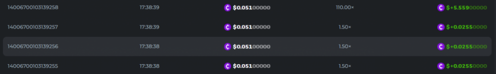 Multiplier: 10x BetID: 17001829907645578 Multiplier: 20x BetID: 17001829907639341 Multiplier: 30x BetID: 17001829907639379 Multiplier: 39.9193x (40x) BetID: 17001829907639399 Multiplier: 40.0809x (40x) BetID: 17001829907645731 Multiplier: 50x BetID: 17001829907639469 Multiplier: 100x BetID: 17001829907641110 Multiplier: 150x BetID: 17001829907641419 Multiplier: 198x (200x) BetID: 17001829907641506 Multiplier: 202.0408x (200x) BetID: 17001829907645757 Multiplier: 247.5x (250x) BetID: 17001829907641626 Multiplier: 253.8461x (250x) BetID: 17001829907646070 Multiplier: 330x BetID: 17001829907641758 Multiplier: 450x BetID: 17001829907641768 Multiplier: 550x BetID: 17001829907641939 Multiplier: 660x BetID: 17001829907643200 Multiplier: 990x BetID: 17001829907646392 Multiplier: 1100x BetID: 17001829907646721- 53 replies