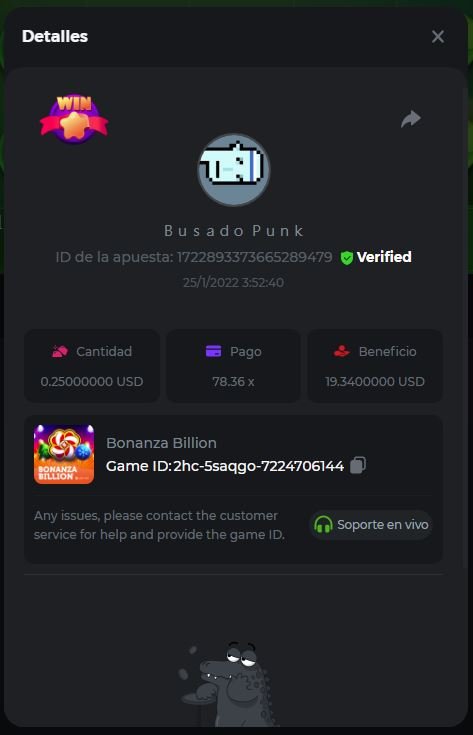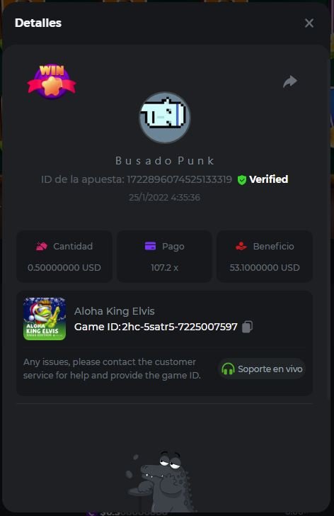 2. x258 Jhonny Cash (+51.40 USD profit) Betting ID: 1722892293557042048 x78,36 Bonanza Billion (+19.34 USD profit) Betting ID: 1722893373665289479 x107,2 Aloha King Elvis (+53.10 USD profit) Betting ID: 1722896074525133319