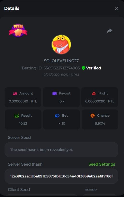 bassabar Posted February 26, 2022 Share Posted February 26, 2022 (edited) 1st bet: 0.0000001 trtl 2nd bet: 1 trtl Total points (1/0.0000001)*100= 1000000000 points 1st bet (10x): https://bc.game/sd/?sd=10F721097E4AVN 2nd bet (10x): https://bc.game/sd/?sd=10F722AXQSEEQB Edited February 26, 2022 by bassabar Link to comment Share on other sites More sharing options...